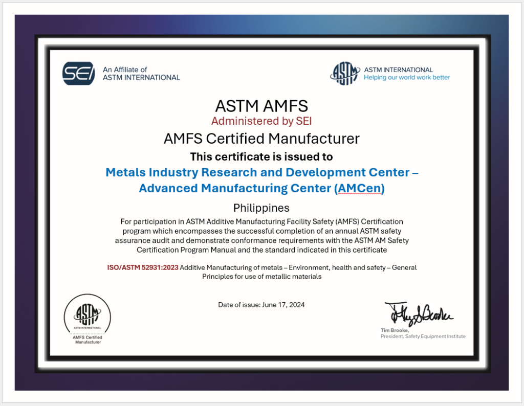 ASTM awarded the first AM Facility Safety Certification to the national Department of Science and Technology’s Advanced Manufacturing Center (AMCen) in the Philippines, demonstrating the program’s global applicability.