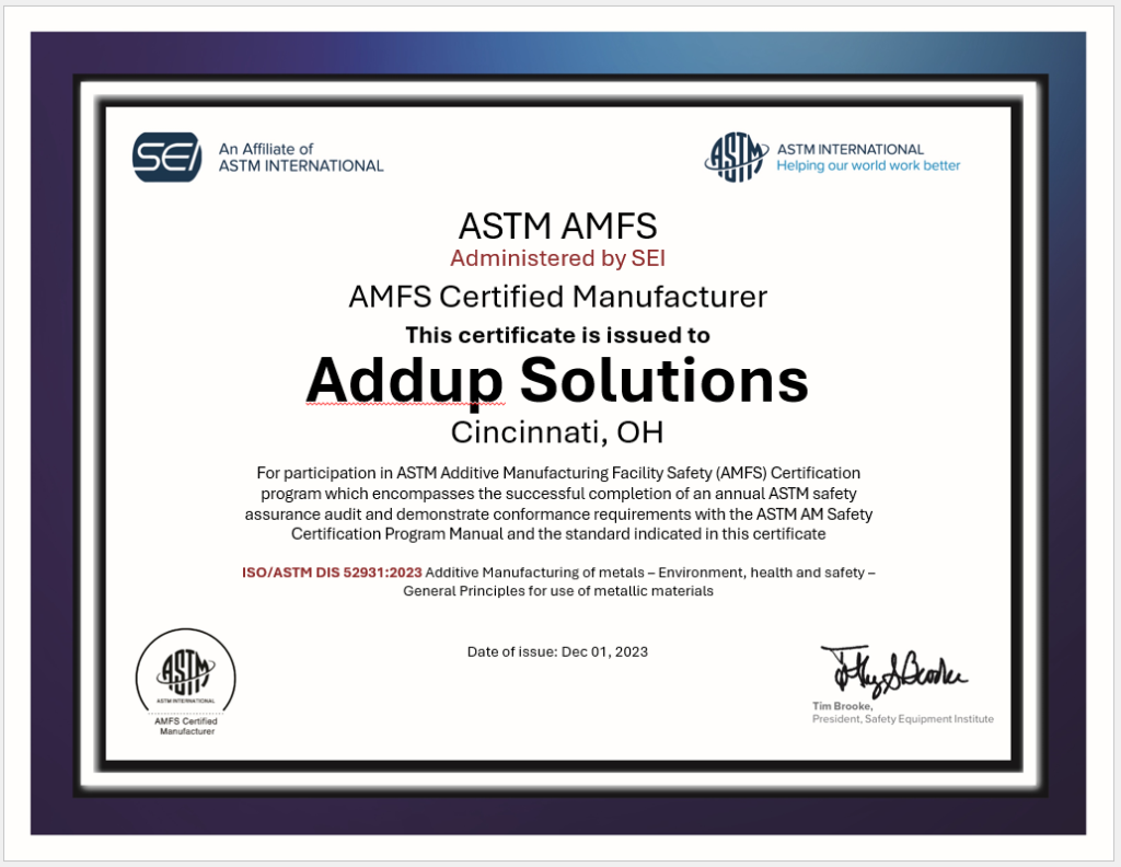- This program provides an endorsement of safety from ASTM that demonstrates your compliance with globally recognized industry-relevant additive manufacturing standards of ISO/ASTM 52931 and UL3400 (soon to be an ASTM standard).